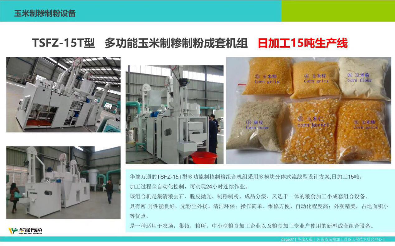 该系列玉米加工小机组主要由集清粮去石、着水调质、脱皮抛光、制糁制粉、成品分级、风选除杂和皮杂收集七部分组成。加工过程全自动化控制,可24小时连续作业;具有密 封性能良好,无粉尘外扬、清洁环保;操作简单、维修方便、自动化程度高;外观精美,占地面积小等优点;是一种适用于农场,集镇,粮所,中小型粮食加工企业以及粮食加工专业户使用的新型成套组合设备。